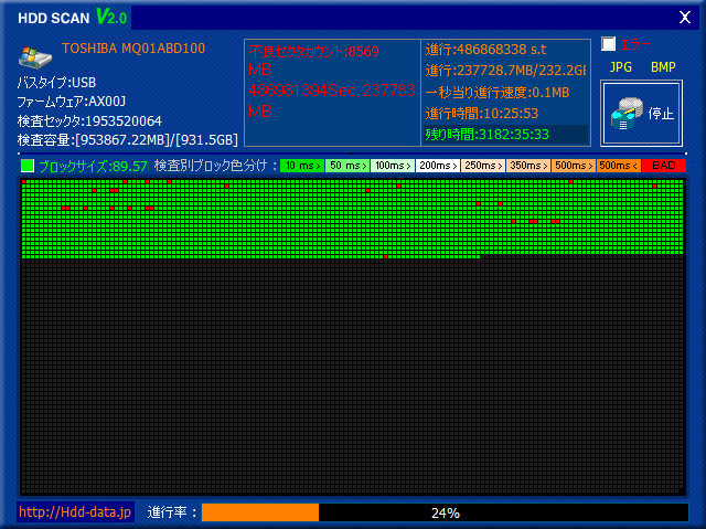 その後、ハードディスクを取り外し、別のハードディスク診断用パソコンに取り付けて検査しました。8時間位かかりましたが、診断が終わらないので、途中で止めました。