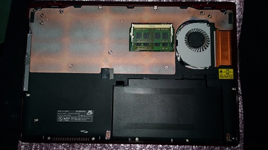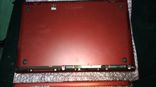 この機種はハードディスクの取り外しが結構面倒です。分解作業に入ります。パソコンを裏側にして、細長いパネル板を手で外します。